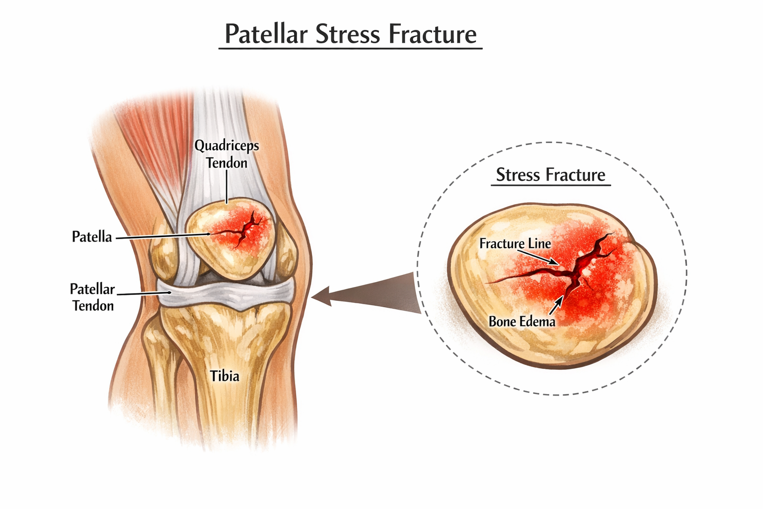 膝のお皿(膝蓋骨)に繰り返し負荷がかかることで、骨に微細なヒビが入る状態を指します。